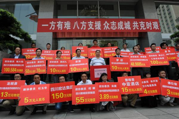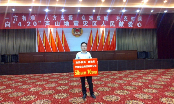 2013年4月25日下午,由省政协组织的“一方有难八方支援众志成城共克时艰——向4•20庐山地震灾区人民献爱心”赈灾活动在四川省政协办公大院举行。中盟企业集团有限公司监事会主席李陈方先生代表公司出席了此次活动,并代表公司向雅安灾区捐赠50万元人民币及价值70万元的物资(图为活动现场)。
